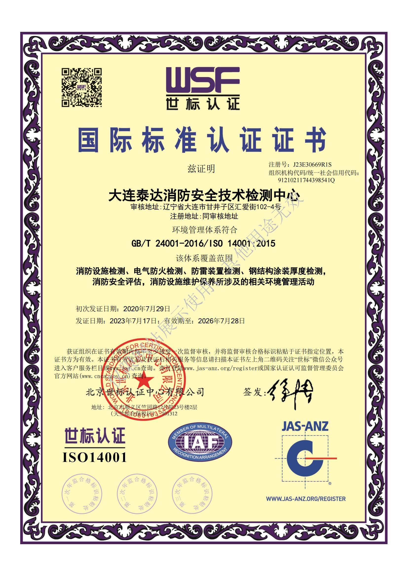 · 是經“社會消防技術服務信息系統”備案并公示的消防技術服務機構,已取得中國氣象局頒發的雷電防護裝置檢測資質證書、遼寧省質量技術監督局審核批準的檢驗檢測機構資質認定證書(CMA)及包括消防檢測、電氣檢測、雷電防護裝置檢測、防火涂層厚度檢測等在內的200余項檢驗檢測能力,取得大連市應急管理局頒發的安全生產標準化證書,獲得質量管理體系、環境管理體系、職業健康安全管理體系認證證書,是經備案的高新技術企業,可獨立出具具有證明作用的檢測報告。